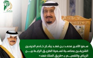 بتوجيه من خادم الحرمين الشريفين تسمية الطريق الرابط بين مدينة الرياض ومنطقة القصيم بـ "طريق الملك فهد" ليكون امتداداً للجزء الواقع في مدينة الرياض. وجّه خادم الحرمين الشريفين الملك سلمان بن عبدالعزيز آل سعود - حفظه